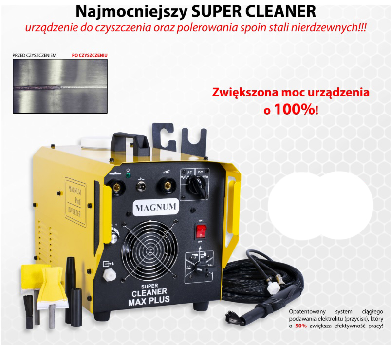 Urządzenie pomaga przywrócić pierwotny kolor stali nierdzewnej, bez czasochłonnego polerowania i niszczenia powierzchni. SUPER CLEANER MAX PLUS posiada opatentowany system ciągłego podawania elektrolitu, pozwalający na zwiększenie efektywności pracy o 50 %, względem tradycyjnych konstrukcji.