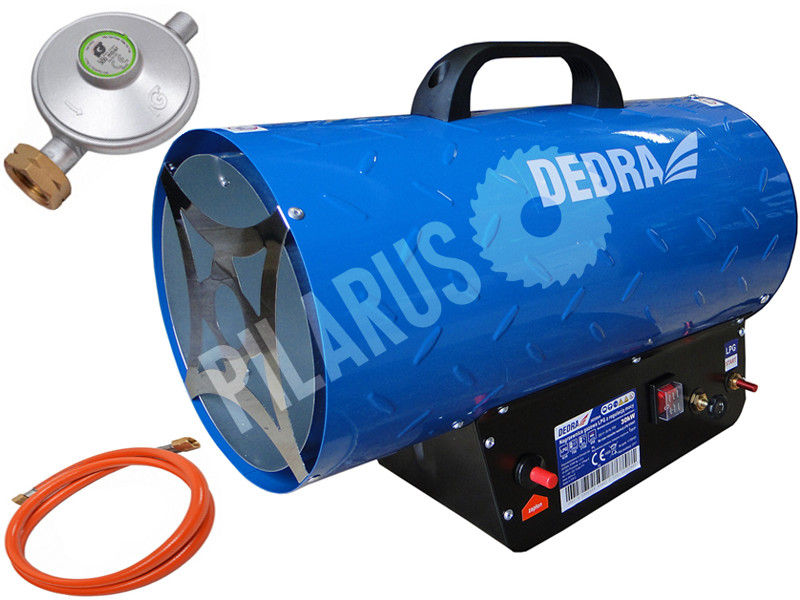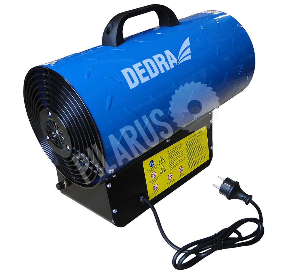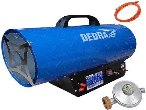 Nagrzewnica gazowa firmy DEDRA model DED9945 z regulacją mocy w zakresie 30 – 50kW to urządzenie do szybkiego ogrzewania pomieszczeń dobrze wentylowanych o powierzchni. Do ogrzewania pomieszczeń potrzebny jest zbiornik z propan-butanem, który jest spalany w turbinie podczas ogrzewania. Zużycie gazu wynosi ok 3,6kg/h przy mocy grzewczej 650m3/h. Wyposażona w ochronę przed przegrzaniem oraz regulację mocy cieplnej.